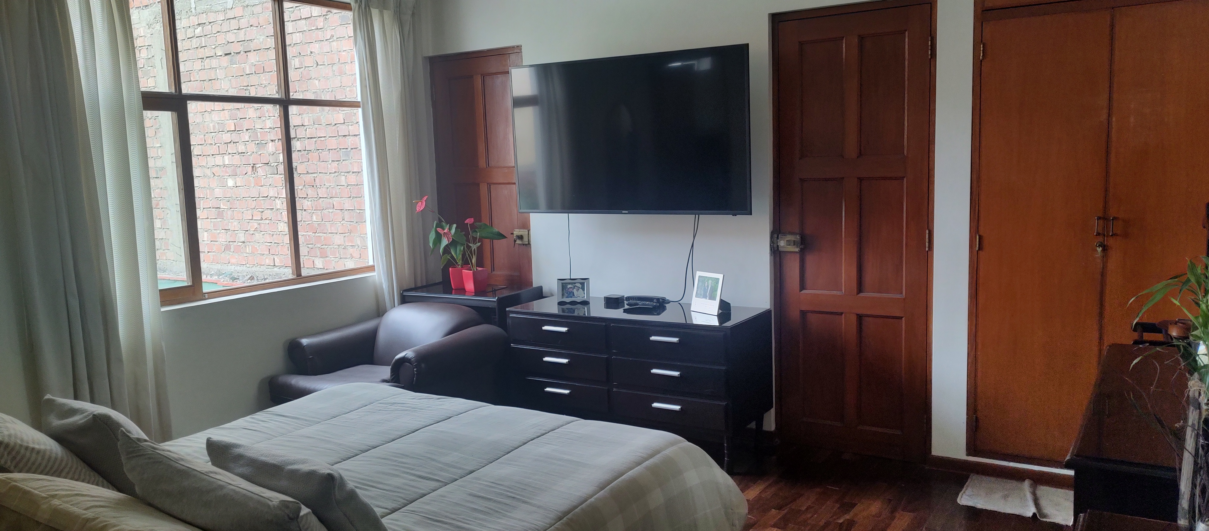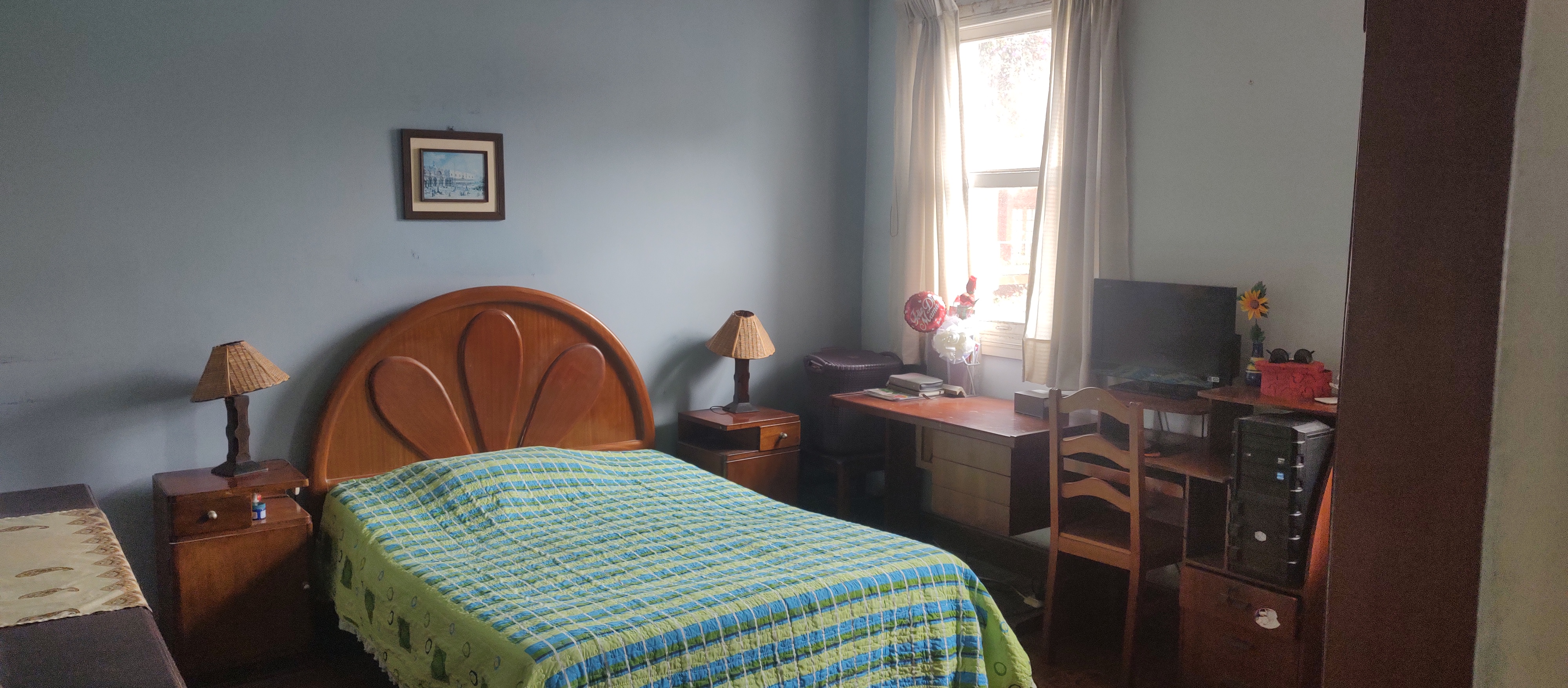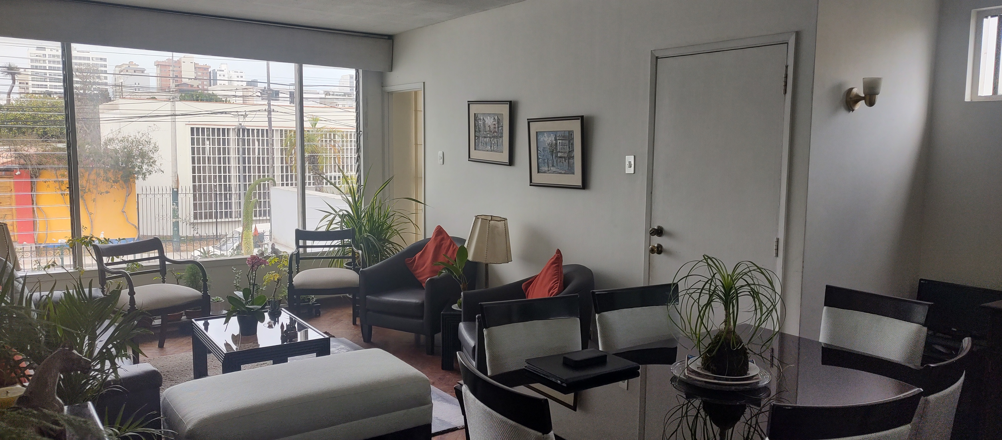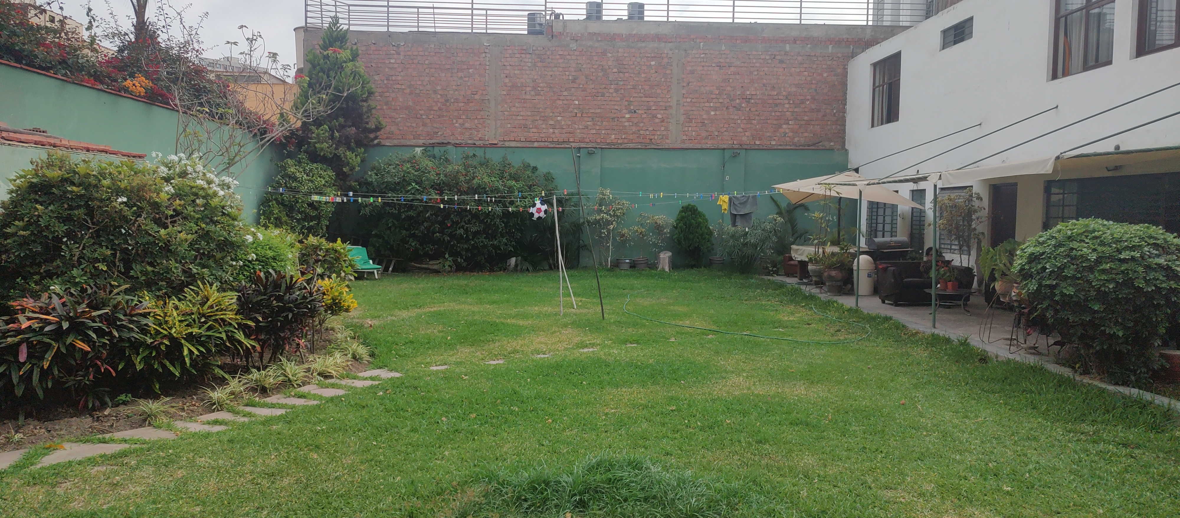 a) Al frente del predio cuenta con una casa de dos pisos, el primer piso tiene amplia sala con ventanales, amplio comedor con vista al patio, cocina y zona de lavandería, baño de visita, y un estudio; el segundo piso tiene cuatro dormitorios de los cuales dos con vista a la calle y dos con vista al patio, con un baños.